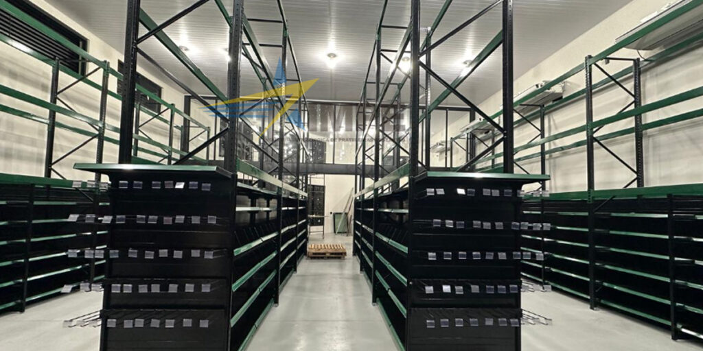 1. Níveis superiores (porta paletes): A parte de cima da estrutura é projetada para o armazenamento de paletes fechados. São longarinas robustas, capazes de suportar cargas elevadas, ideais para o estoque de segurança ou de alto volume. Aqui, os produtos ficam armazenados em suas embalagens originais, aguardando o momento da reposição.